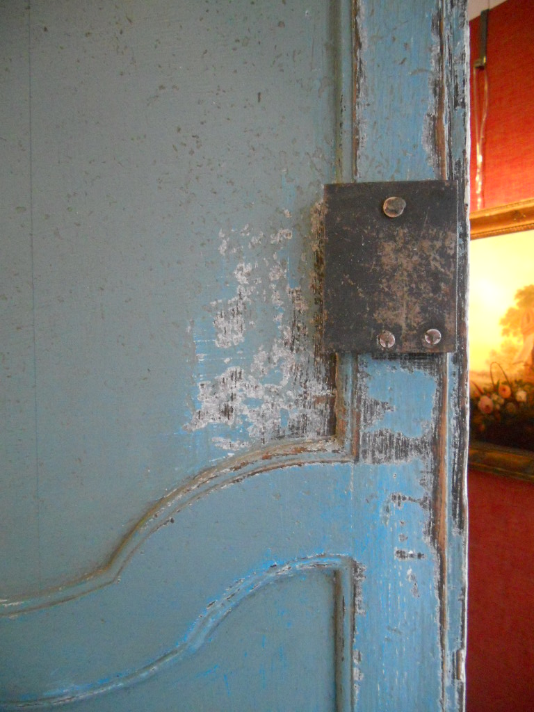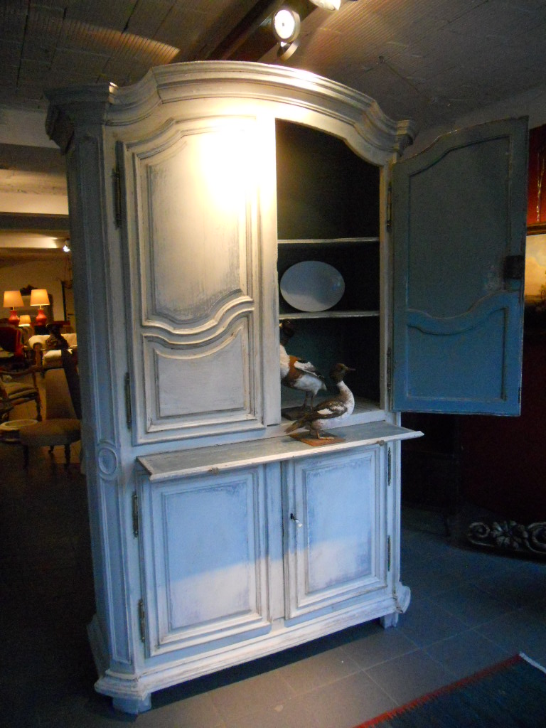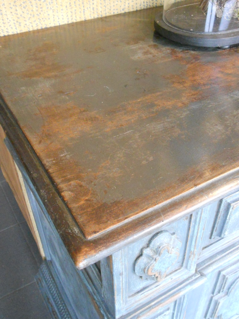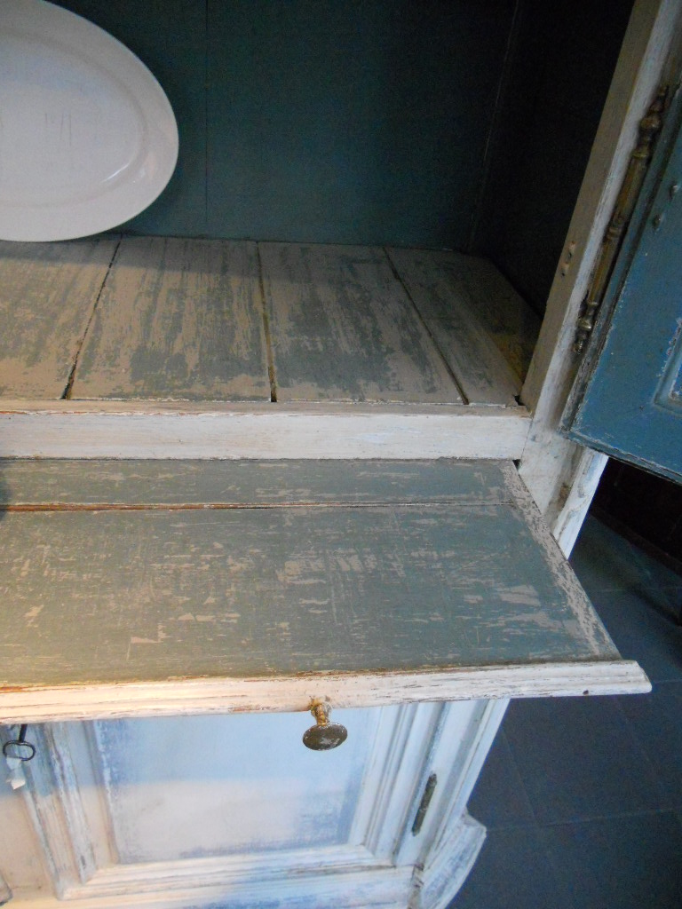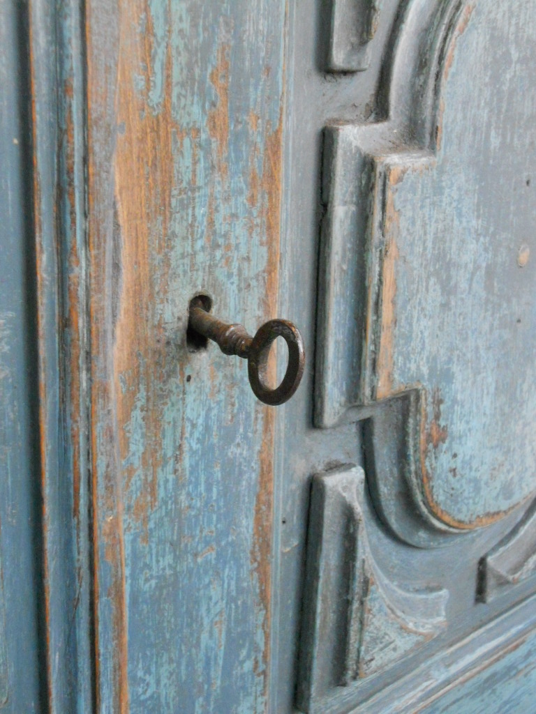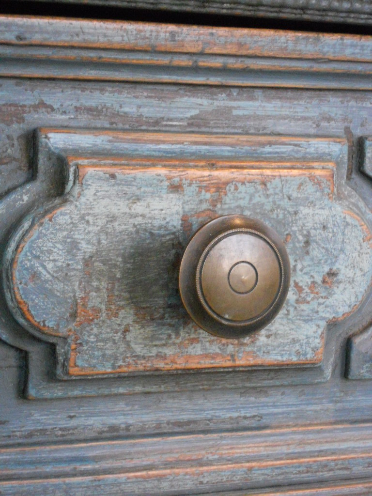 Great blue heaviley distressed patine for this Italian dresser,bronze handles and two working locks.