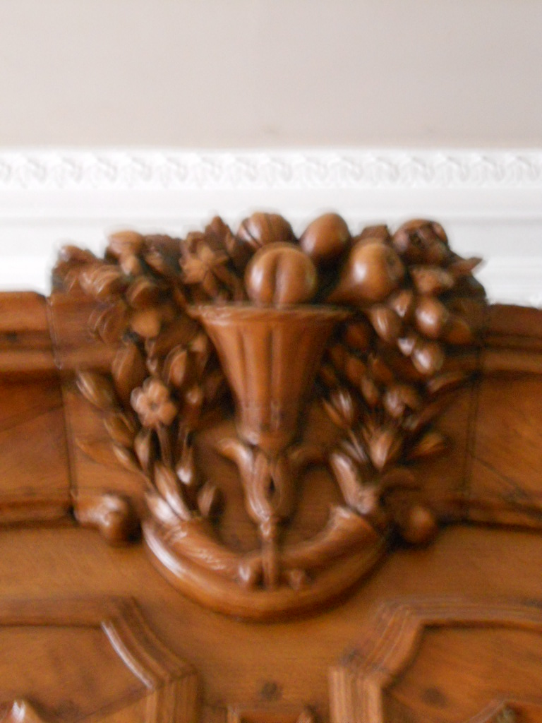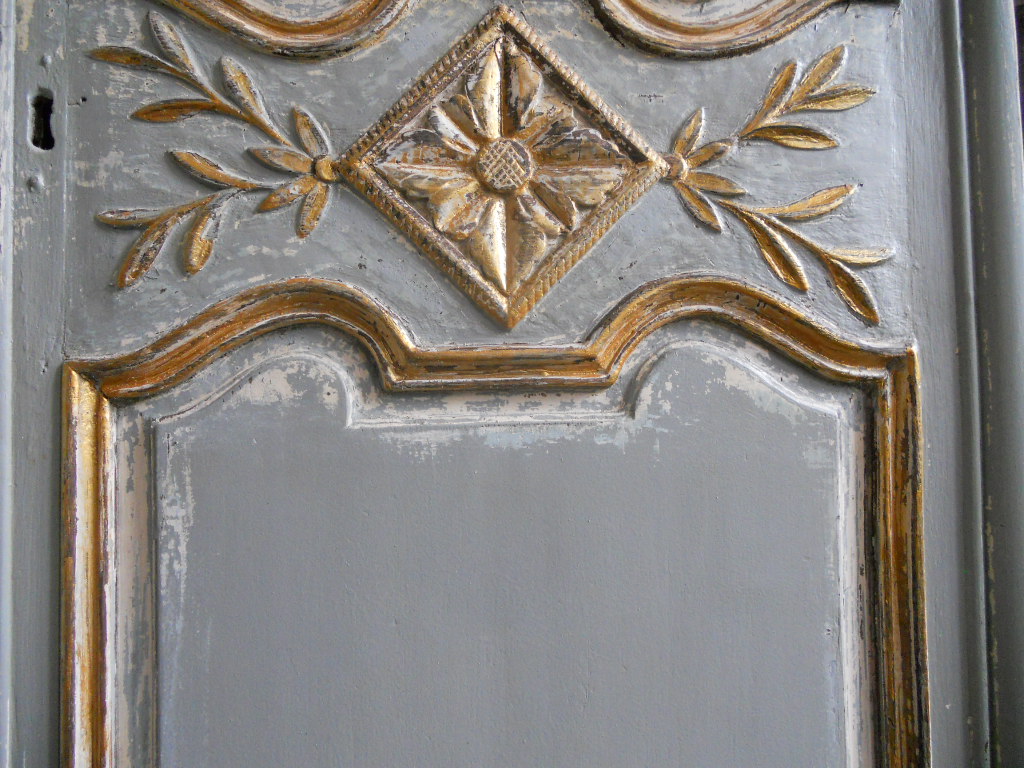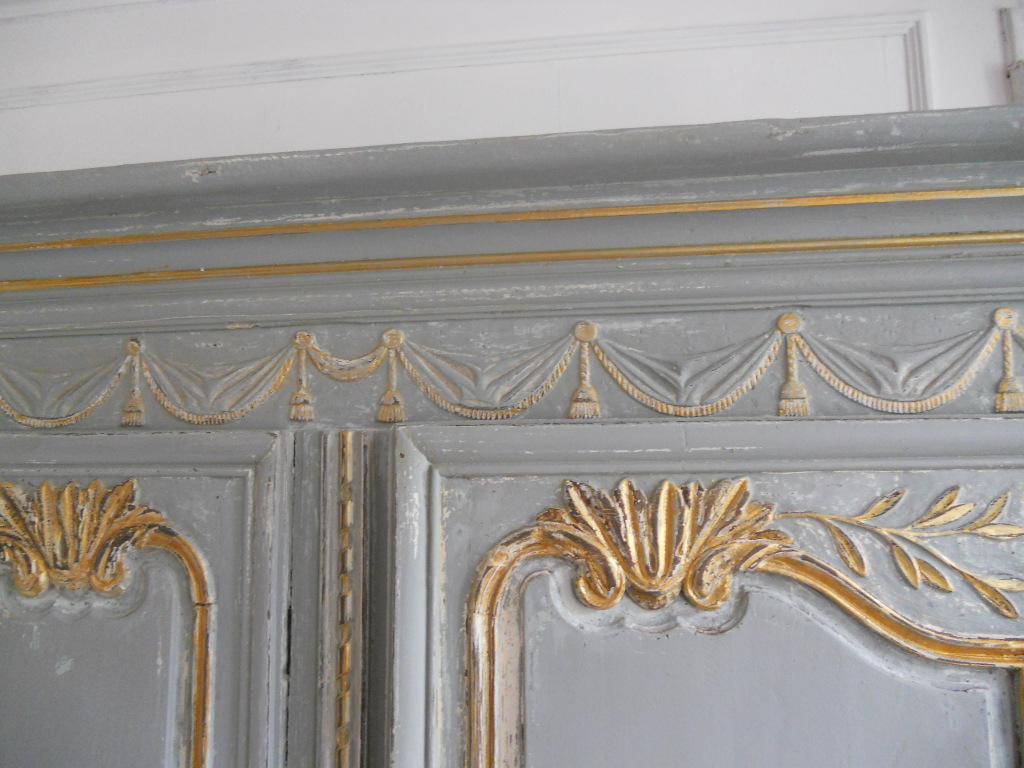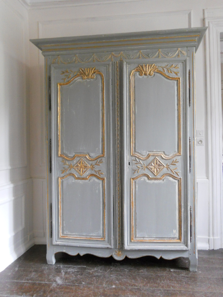 Elegant french armoire of small proportions.Painted and scraped finish with traces of gilding Old and later paint
