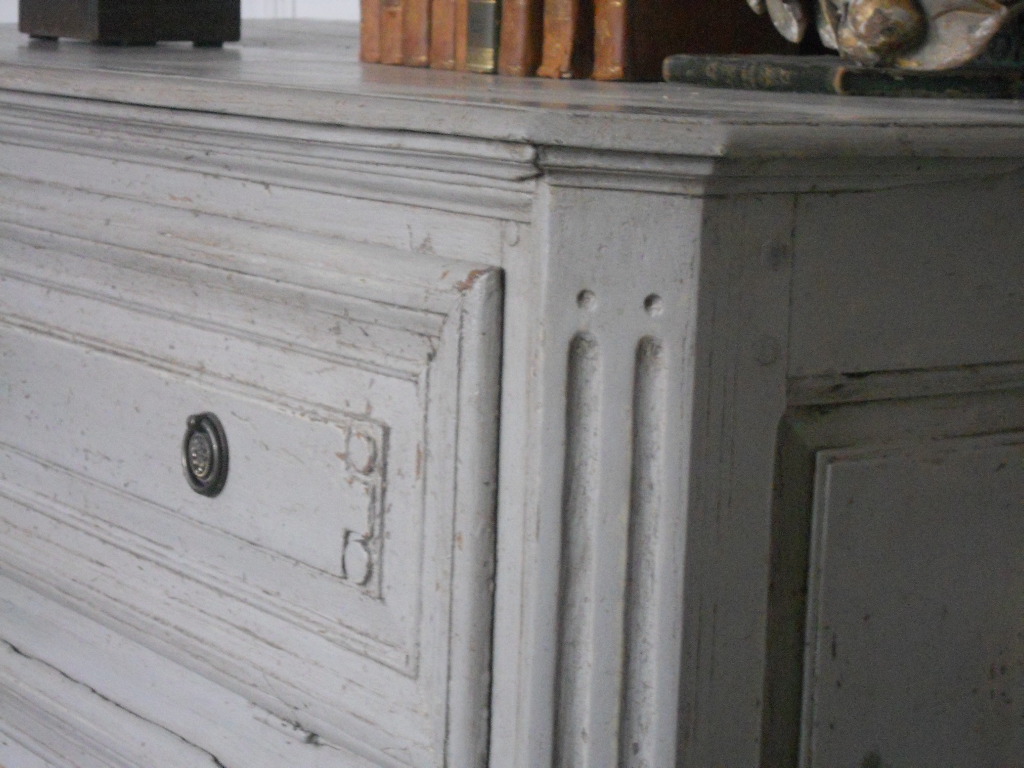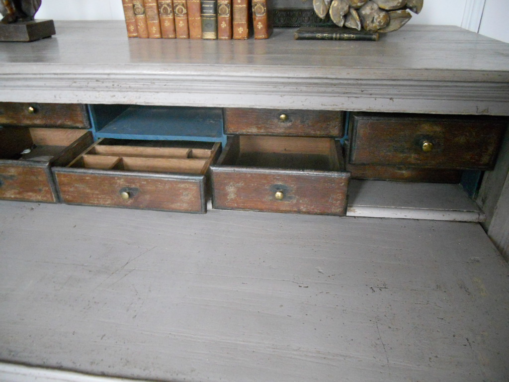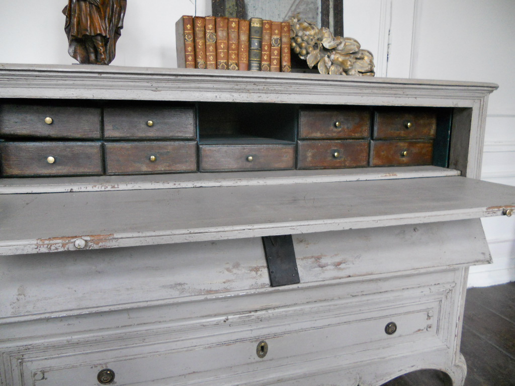Period louis 16 chest in a pale grey patina.The topdrawer hides a real working cabinet with many little drawers and an extendable workingtop