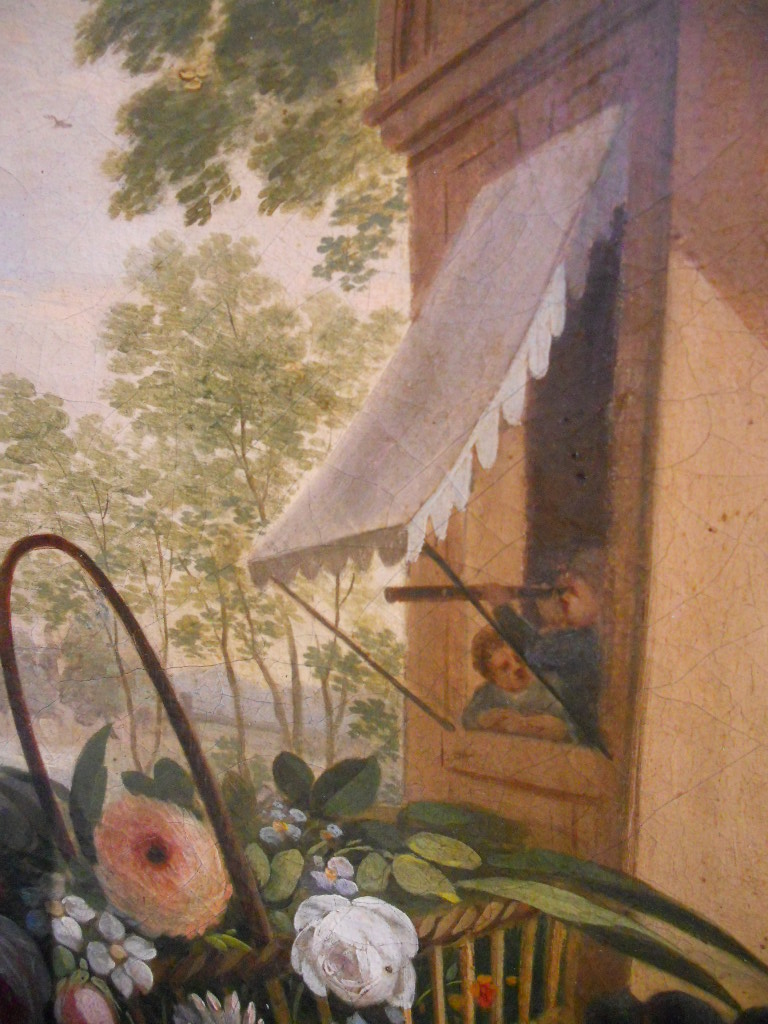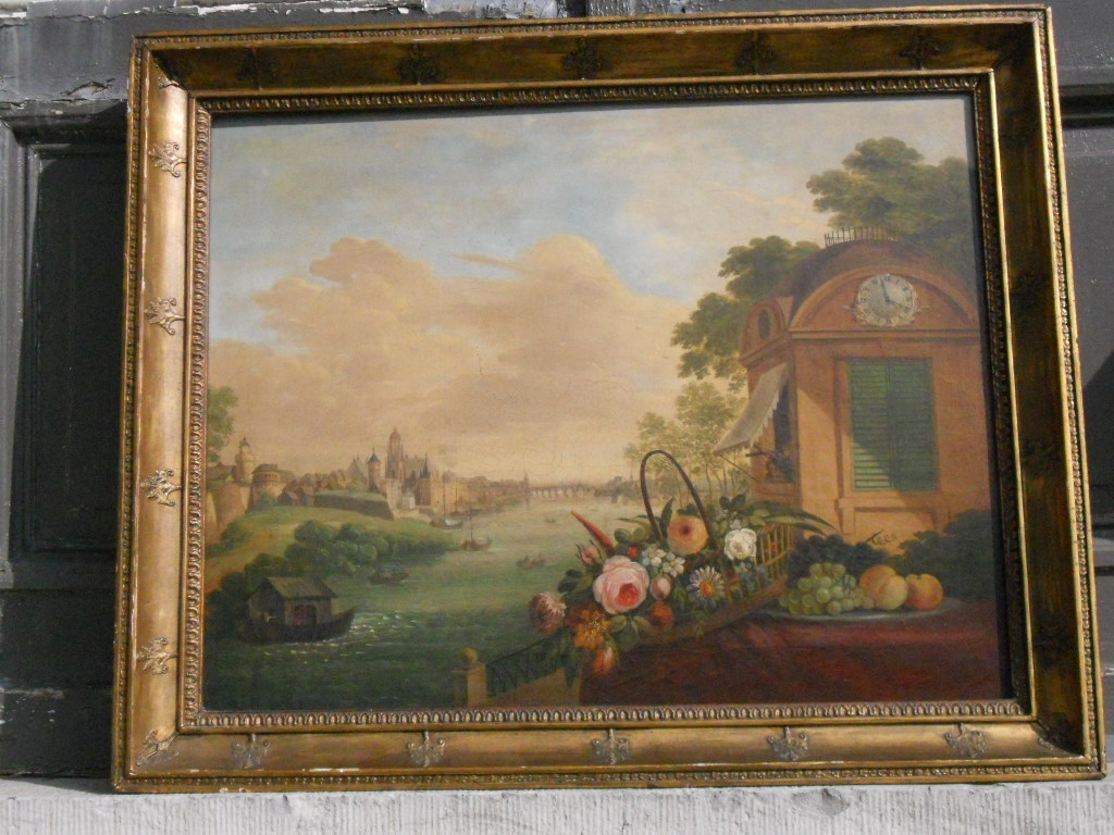 A chartreuse is a limestone 18 th century winemakers manor overlooking the river.This very early 19th century french painting depicts really all the delights of La douce France One restoration, excellent condition and fresh vivid colours.