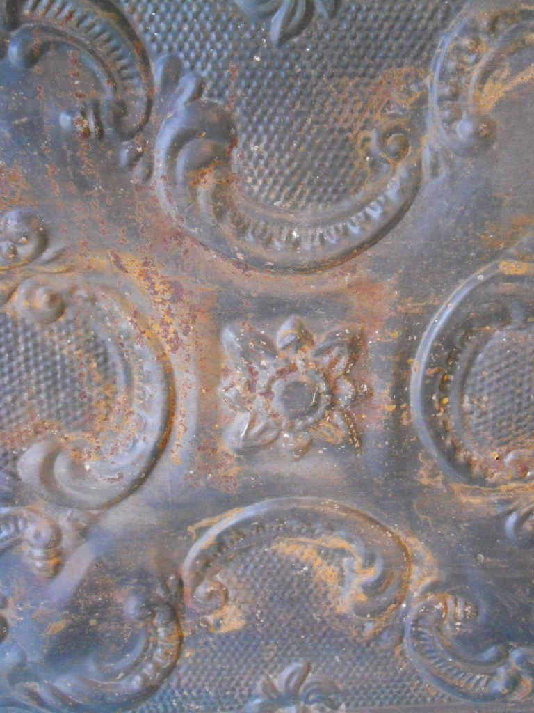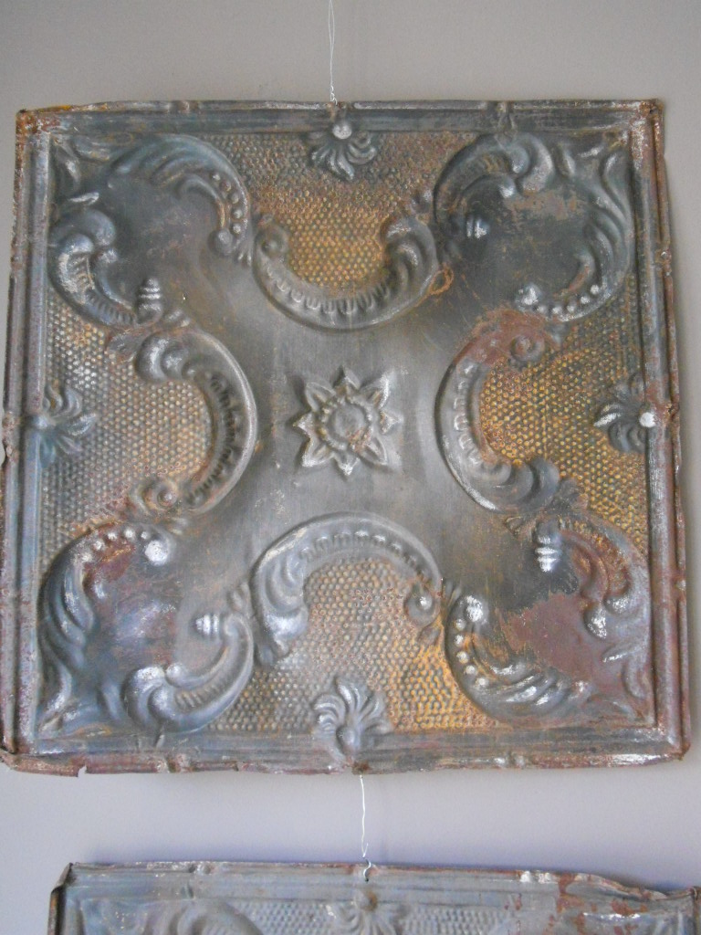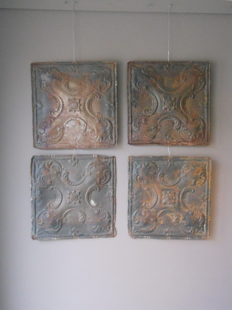 A set of 4 embossed and brocaded metal decorative panels from a panelled ceiling each panel has a beautiful patina and measures 62cmx62cm circa 1900