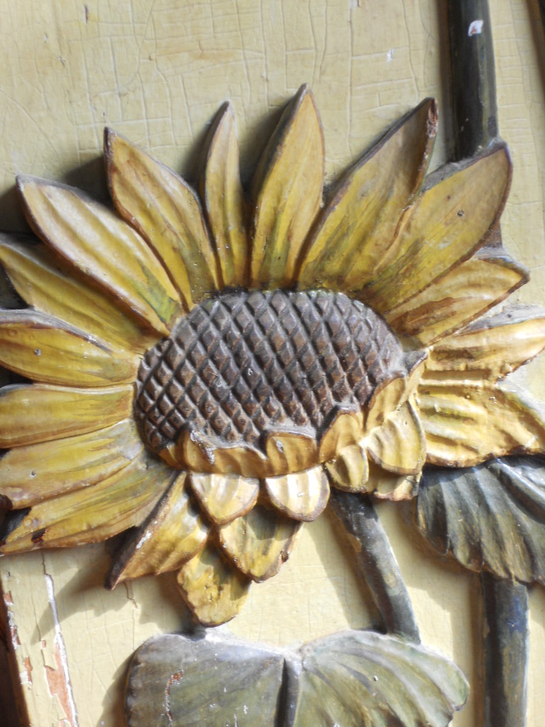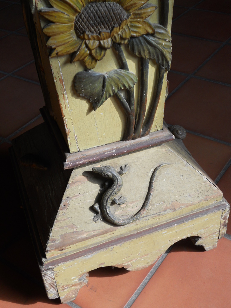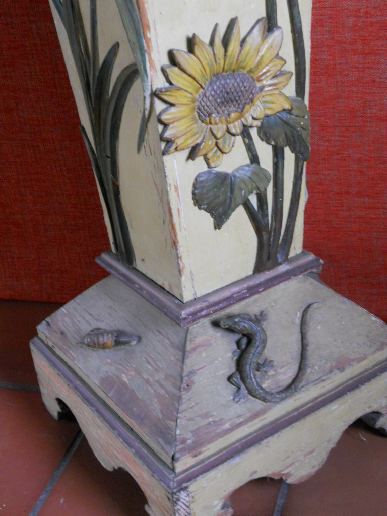 A collectors' item,highly decorative,wooden plantstand,ornated with flowers,butterflies,snales,etc,etc...all sculpted in wood,and in the original paint.High 123cm/square base 29cmx29cm France circa 1900