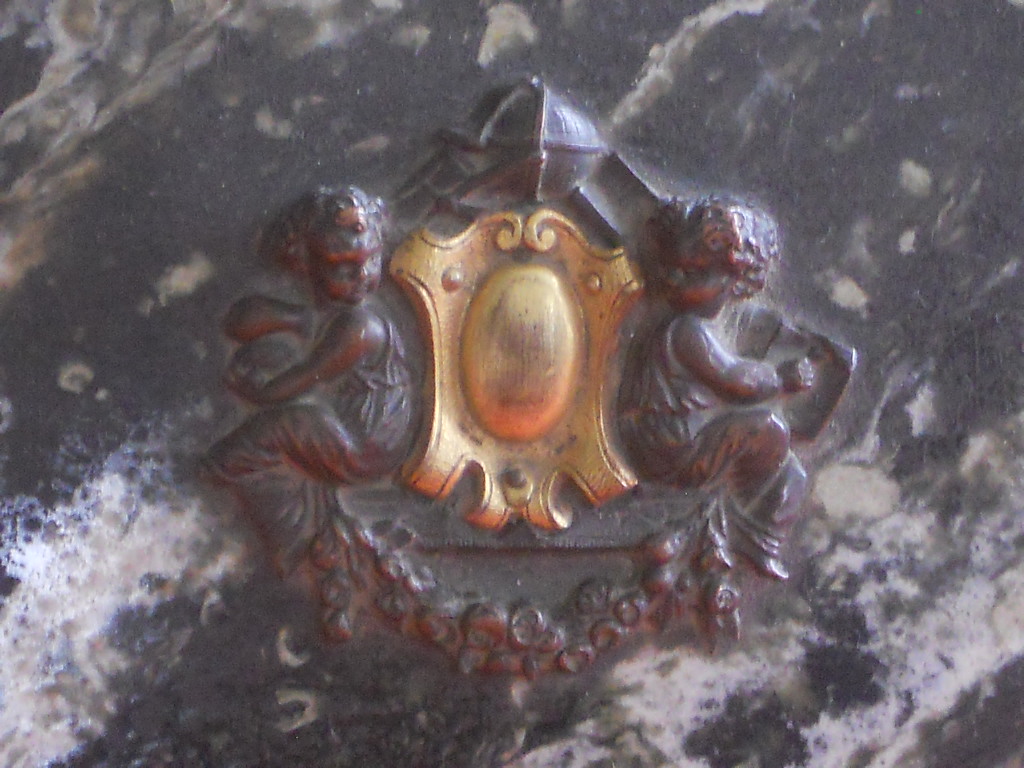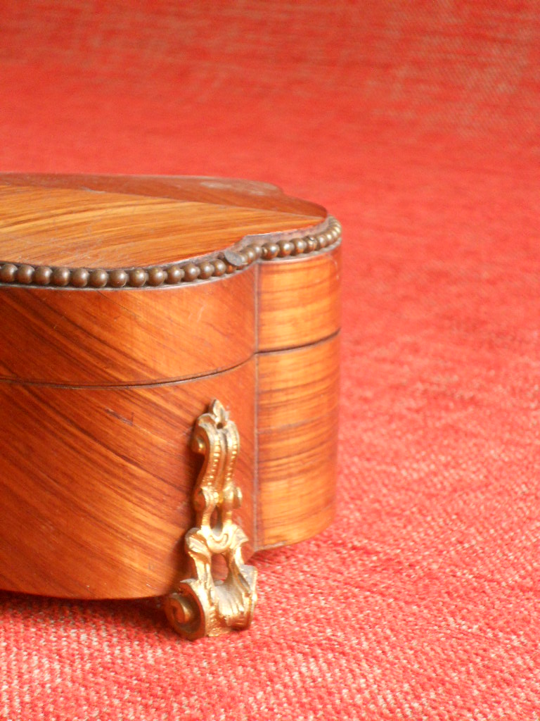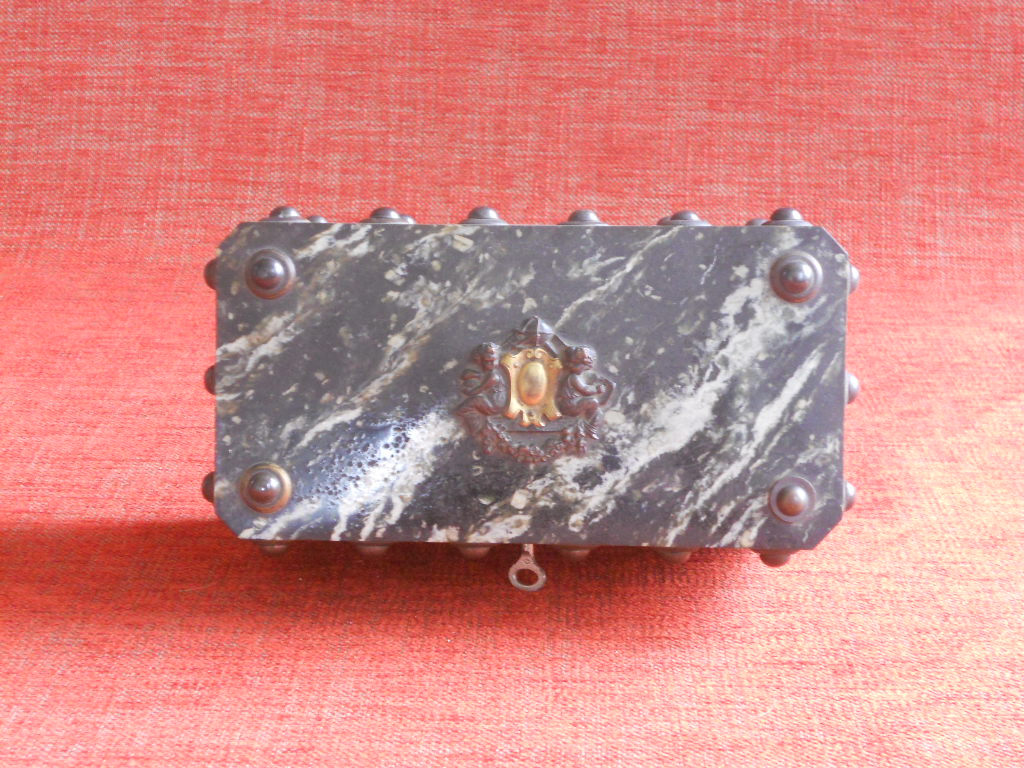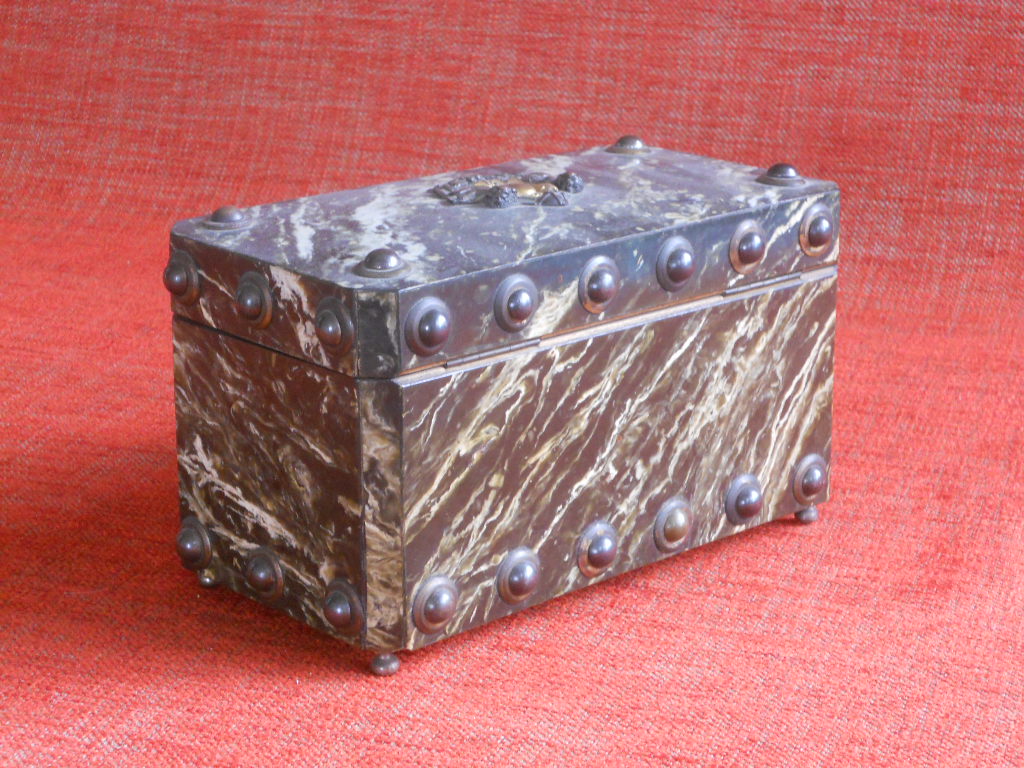 Very decorative wooden teabox,in a faux-marble finish and ornated with decorative nails in the renaissance taste,and a little handle decorated with cherubs.