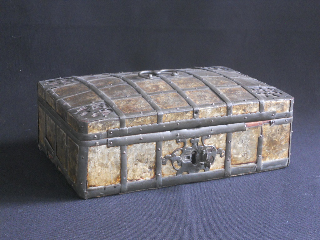 A very elegant wooden box,circa 1820.Covered with Tin plates in the Walton-technique.Some lacks in the metalware.feel free to ask more detailed pics.The top is slightly dome-shaped.