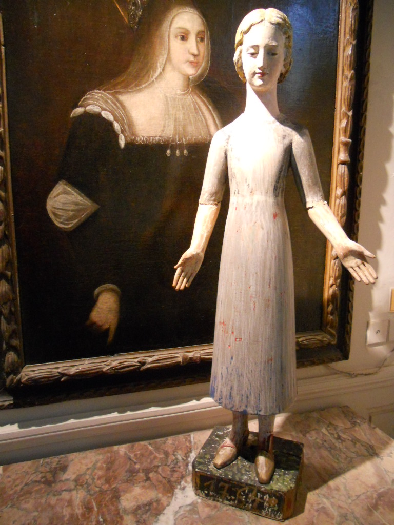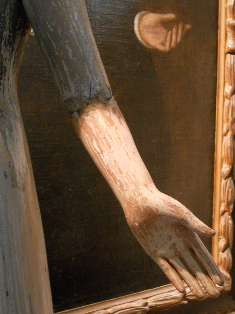 A beautiful and very original piece of art.Scraped to its original paint Entirely sculpted in wood,very good condition,oneminor (old restauration at one finger)High:98,5cm/deep:18cm/wide:23,5cm