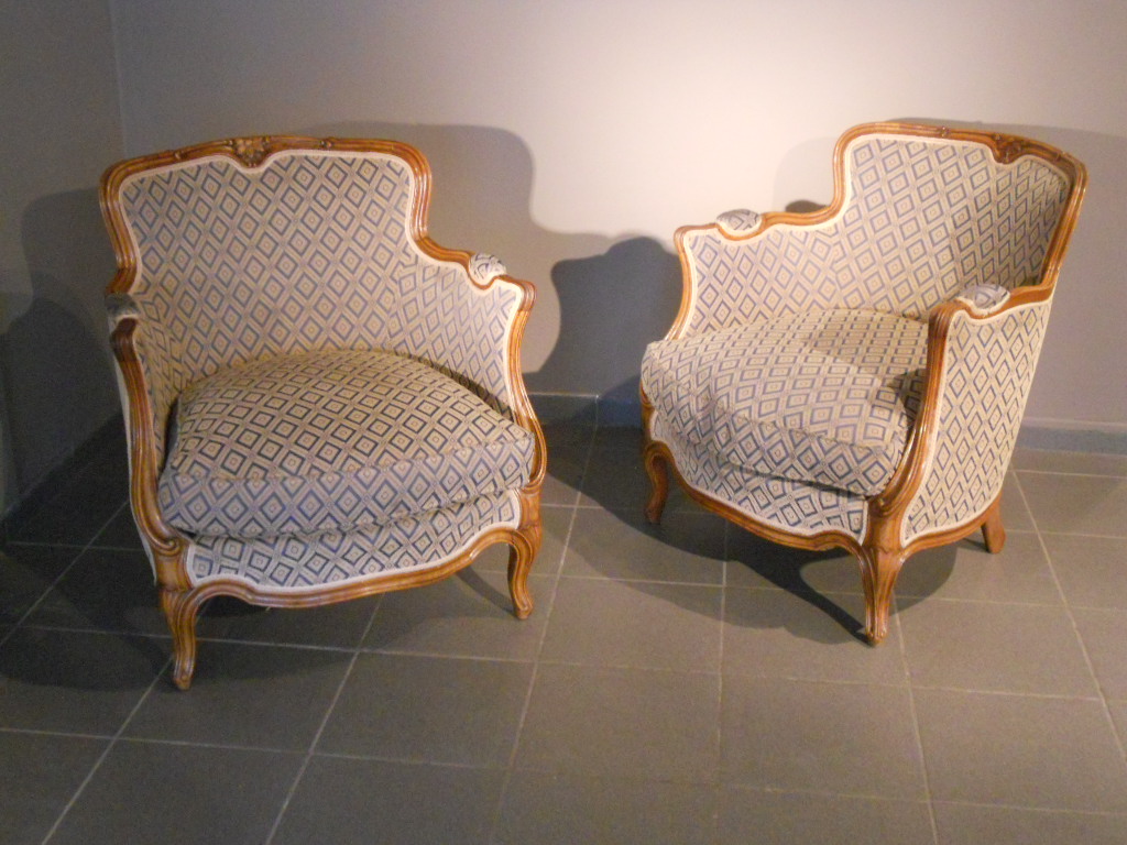 Very fine pair of comfortable petite bergeres in perfect condition,original fabric no stains 75cm high,72cm large,76cm deep