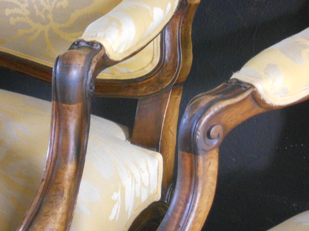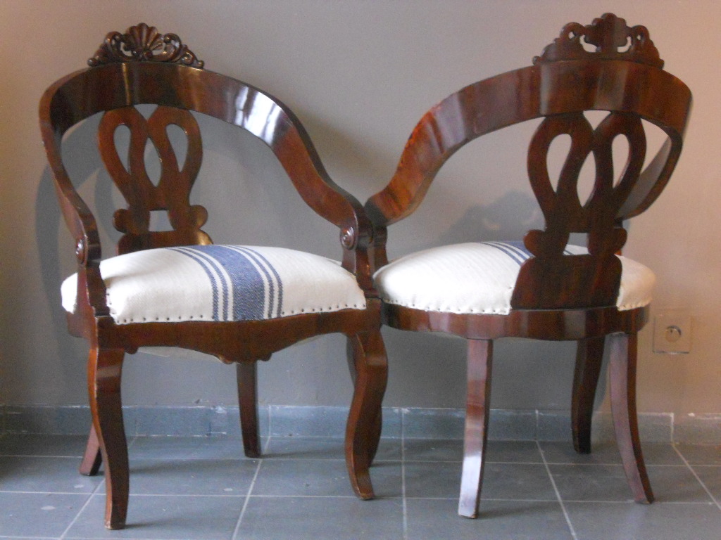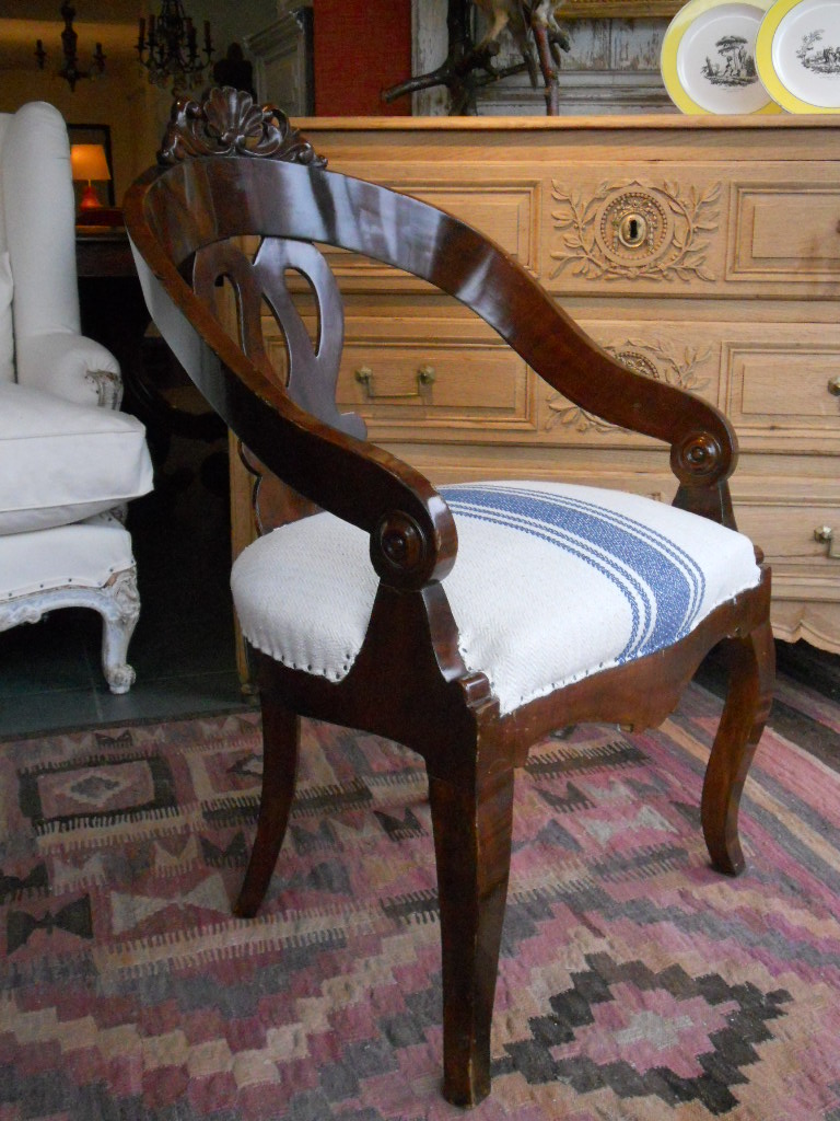 Newly upholstered in torchon-cotton. A suite of 4 VERY COMFORTABLE,and decorative armchairs in mahogany Italy 19th century