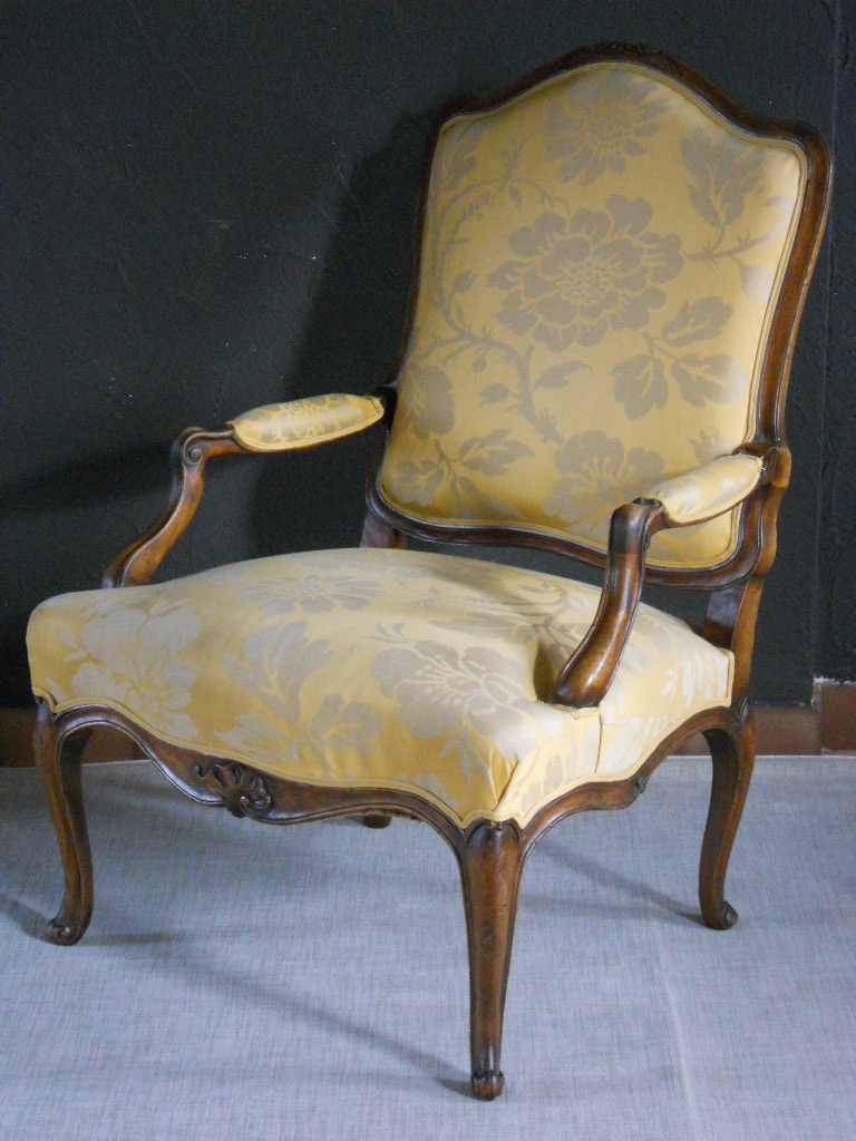 Very elegant pair of walnut armchairs,extra large Nice old yellow fabric in fair condition Measurements:wide:72cm/63cm deep/High:106cm France 1940