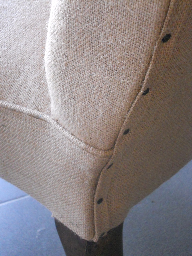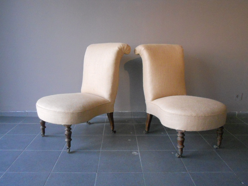 Upholstery in jute for this pair of Napoleon III slipperchairs ,still retaining the original paint ,and wheels. Measurements:High:82cm/Deep:77cm/Wide:52cm France circa 1890