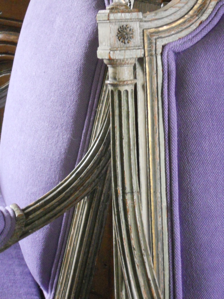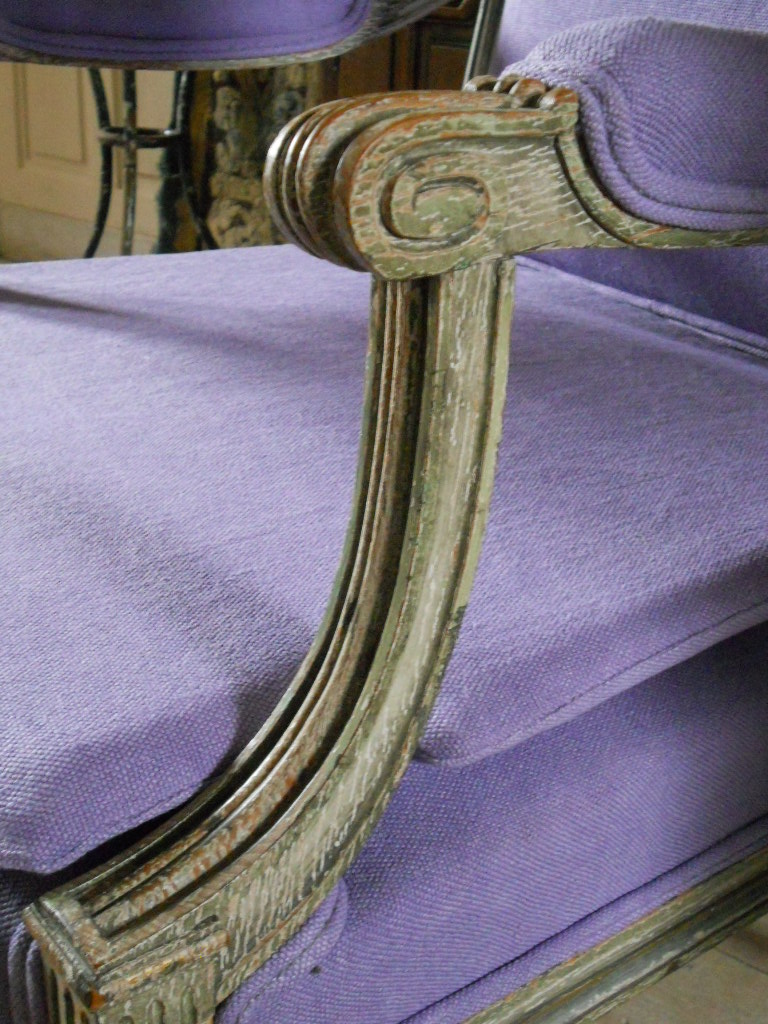Pair of 19th century French Louis XVI fauteuils in an incredible and original patina. Upholstered in hand dyed lavender bleu linen SOLD