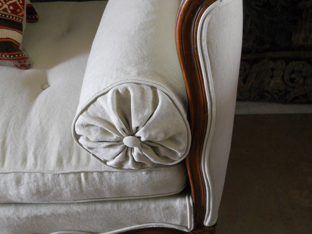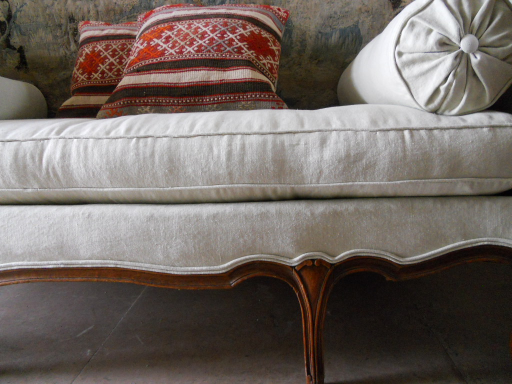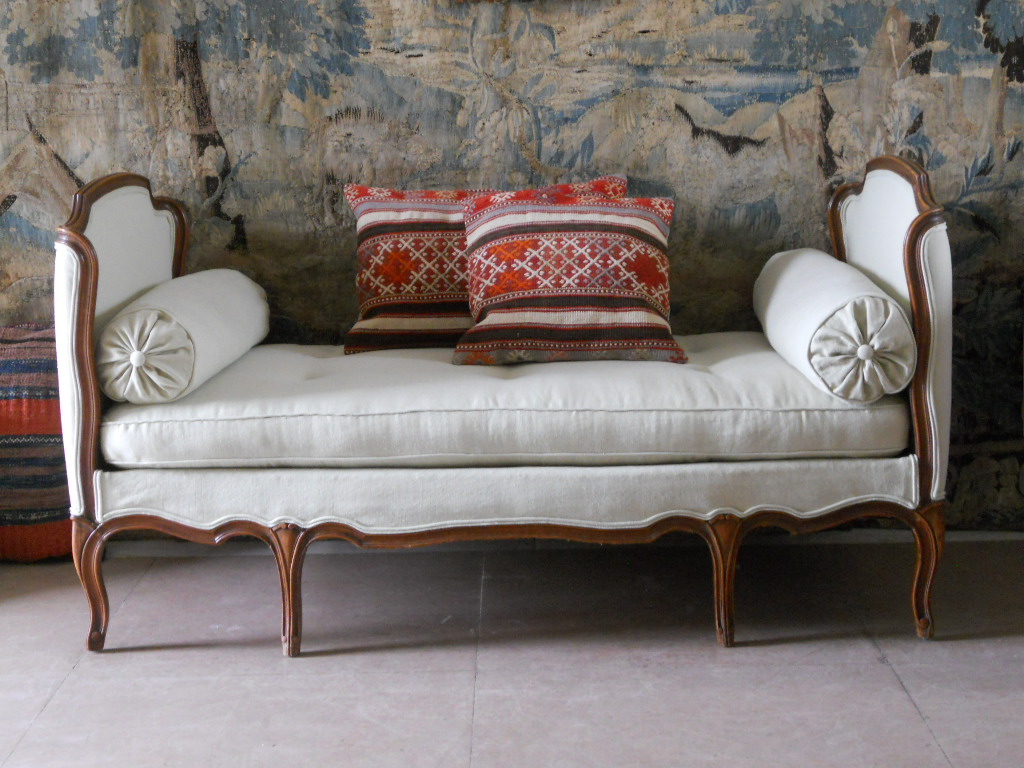 19th century Louis Quinze lit-de-repos 170cm/85cm/90cm.Beechwood and wallnut in a natural waxed finish.covered in a sophisticated Lime natural linen . SOLD