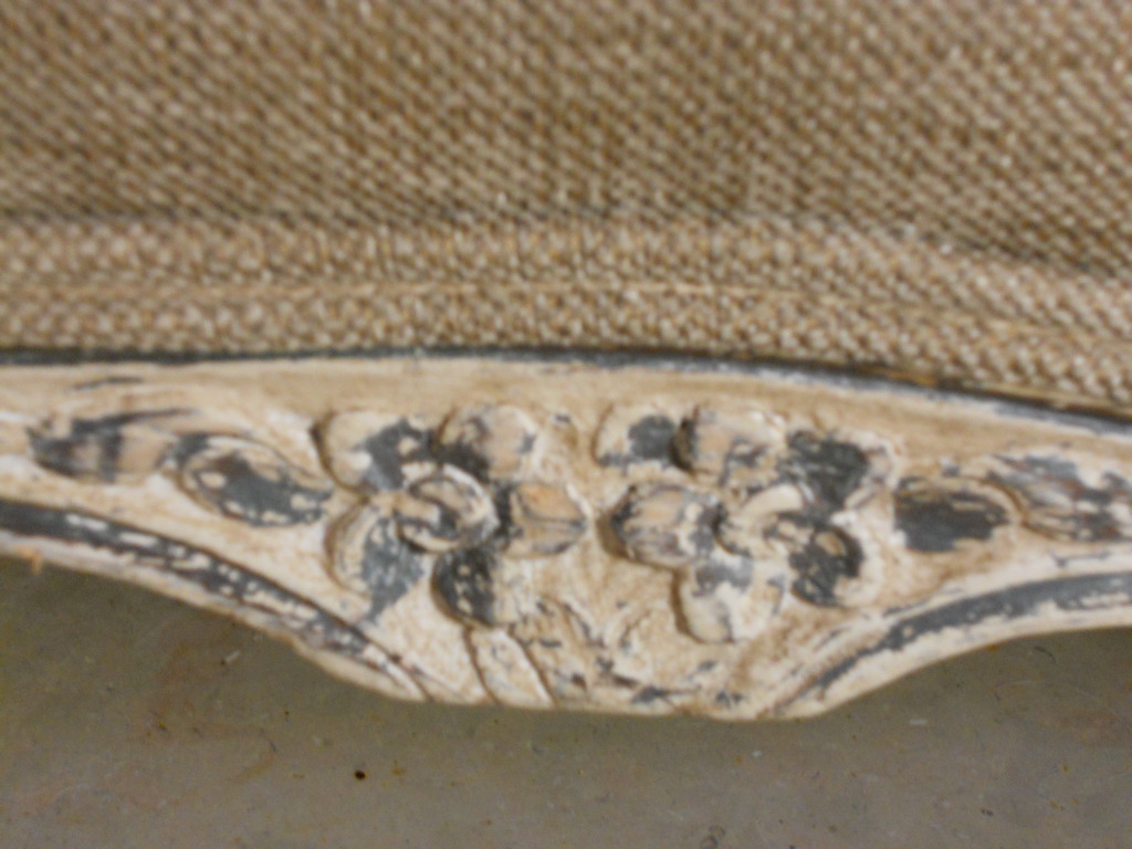 Extreme comfort in this pair of french bergères,low backs deep seats and scroll feat.A nice two colour patina.Upholstered in a neutral Hempcolour fabric