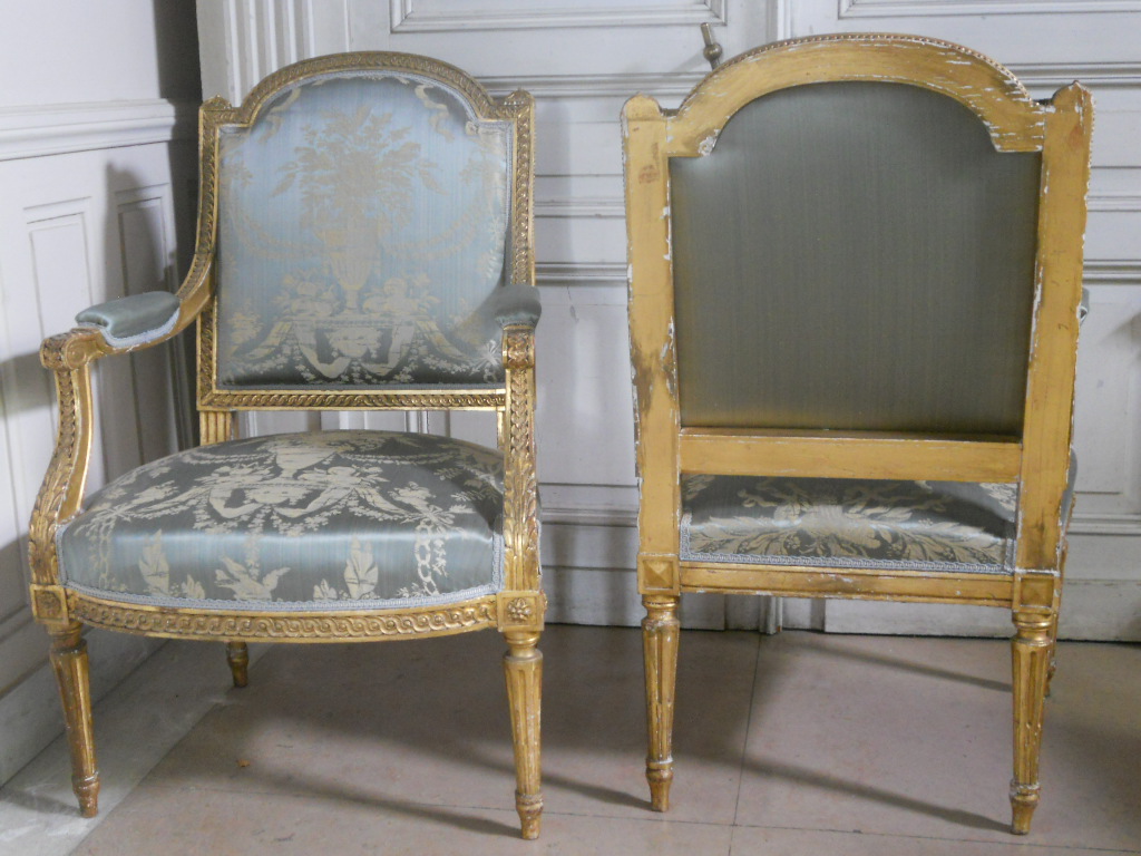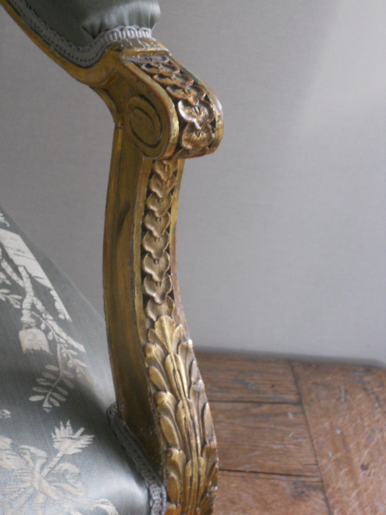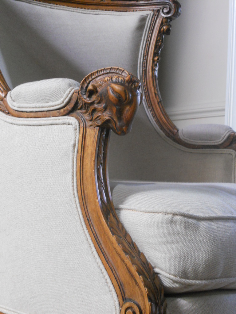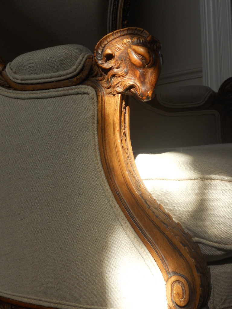 A great and wide french wingchair Every inch of the beechwood frame is delicately sculpted in the Louis XVI manner